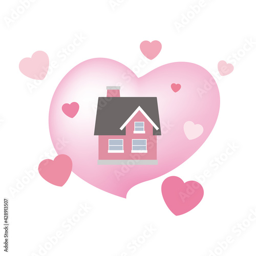 Sweet lovely home full of happiness. Pink house and hearts vector illustration.
