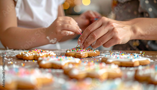 Sweet Moments of Baking: A close-up view captures a heart-warming scene where hands are meticulously decorating delicious star-shaped cookies with colorful sprinkles, creating delightful desserts.