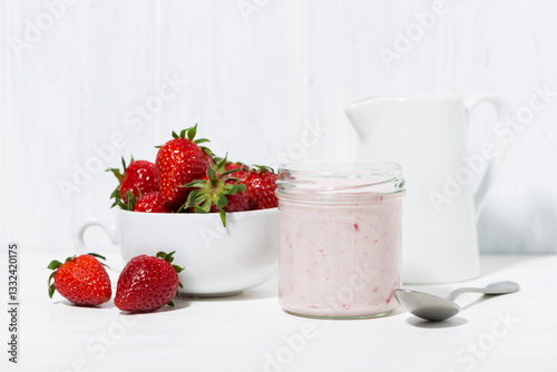 sweet strawberry yogurt and fresh berries on a white table