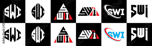 SWI letter logo design in six style. SWI polygon, circle, triangle, hexagon, flat and simple style with black and white color variation letter logo set in one artboard. SWI minimalist and classic logo
