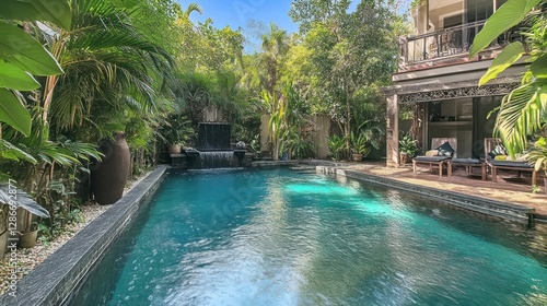 Swimming Pool with Waterfall Feature Surrounded by Tropical Greenery