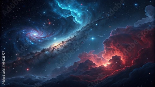 Swirling blue and red nebula clouds in a dark space background with stars and galaxies forming in the distance, nebula, interstellar medium, galaxy formation, starry night