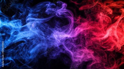 Swirling blue and red smoke against a dark background, creating a mystical and dramatic atmosphere.