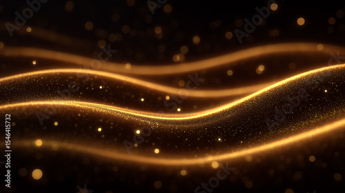 Swirling golden waves illuminated by sparkling particles create an enchanting abstract effect. Dark background enhances luminous appearance, ideal for digital art, luxury branding, event promotions