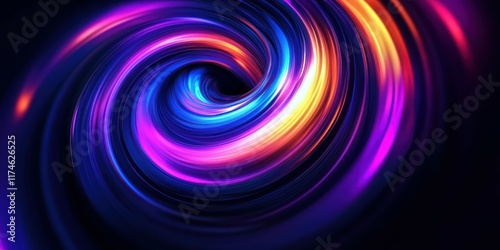 Swirling neon spiral, vibrant rainbow colors, glowing energy vortex, abstract digital art, electric blue and purple hues, dynamic motion blur, cosmic whirlpool, dark background, luminous streaks, psyc
