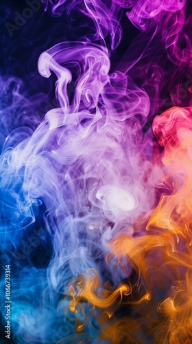 Swirling plumes of vibrant smoke create an ethereal abstract design with colorful patterns against a dark gradient background, showcasing hues of purple, pink, blue, and orange