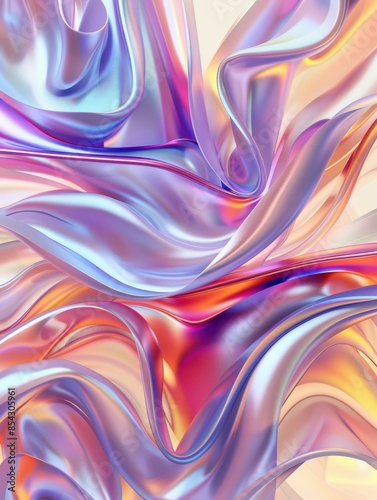 Swirling waves of iridescent colors in satin-like textures. A harmonious blend of pastel blues, purples, and warm oranges creates a mesmerizing, fluid motion.
