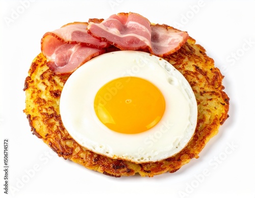 Swiss rösti with fried egg and bacon isolated on white background for breakfast or rustic cuisine concept