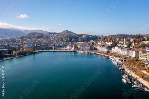 Switzerland, Canton of Lucerne, Lucerne, Aerial view of lakeshore city in autumn