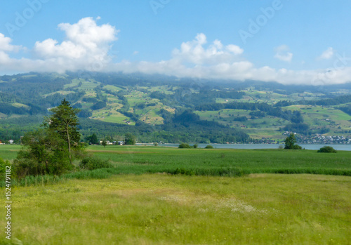 Switzerland, Meiringen, a large green field with a mountain in the background