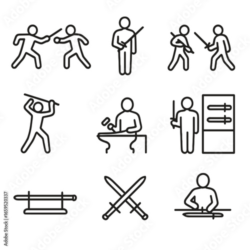 Sword Activity Icons. Outline icon set of sword-related activities: fencing, swordsmanship, dueling, training, crafting,