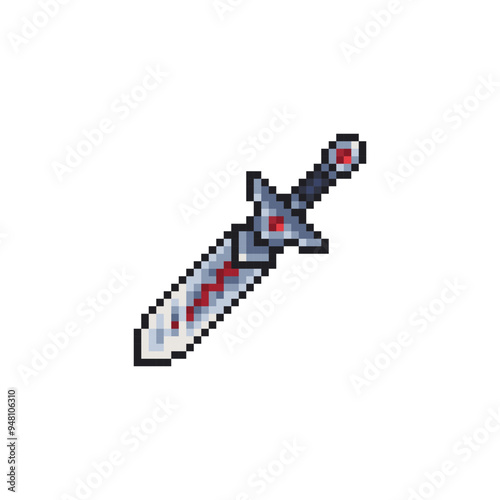 Sword, pixel art style icon, medievalist weapons, isolated vector illustration. Design for sticker, mobile app and logo. Game assets 8-bit sprite.