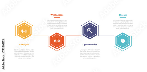 swot analysis infographics template diagram with hexagon outline up and down horizontal direction 4 point step creative design for slide presentation