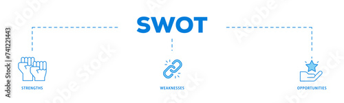 SWOT icons process flow web banner illustration of value, goal, break chain, low battery, growth, check, minus, and crisis icon live stroke and easy to edit