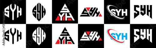 SYH letter logo design in six style. SYH polygon, circle, triangle, hexagon, flat and simple style with black and white color variation letter logo set in one artboard. SYH minimalist and classic logo