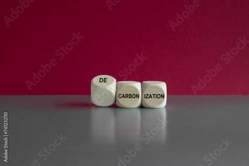 Symbol to reduce carbon dioxide. Turned wooden cubes and changes words carbonization to decarbonization. Grey table, red background, copy space. Business concept.