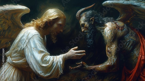 Symbolic confrontation: battle between God and the devil, good and evil, Jesus Christ and Lucifer, struggle of opposites, the eternal conflict between light and darkness in religious representations.