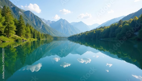 Symmetrical lake reflections, calm water surface, shoreline, design, natural