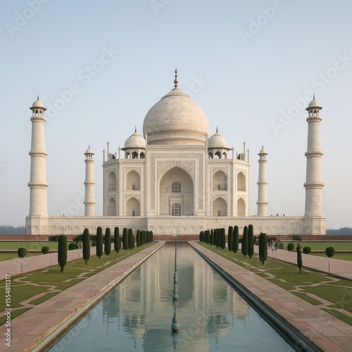 Symmetrical photo of Taj Mahal with reflecting pool and clear sky, highlighting Mughal architecture and cultural identity