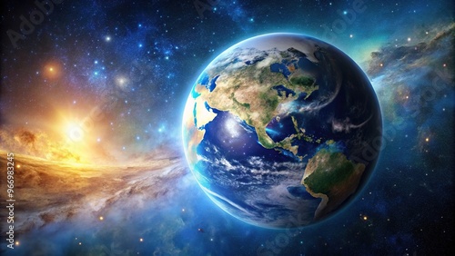 Symmetrical planet Earth viewed from outer space with copy space of the star-filled galaxy