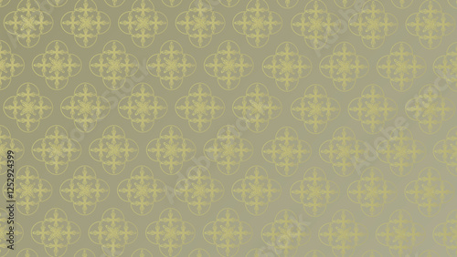 Symmetrical star like designs with eight points, surrounded by clover like outlines. The motif is rendered in a light yellow color on a muted greenish gray background, creating a visually appealing.