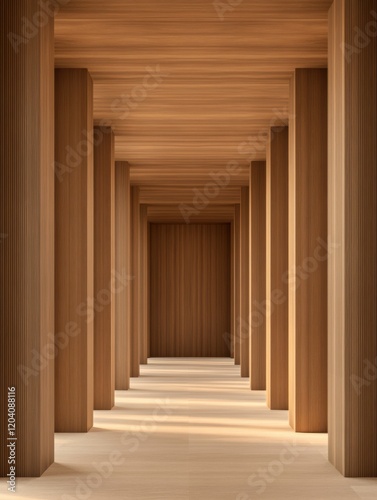 Symmetrical wooden hallway with columns creating a serene and peaceful architectural design, emphasizing lines and natural textures.