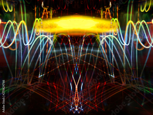 Symmetry and reflection. Light effects. Neon glow. Abstract blurred background. Colorful pattern. Texture.