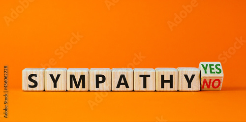 Sympathy yes or no symbol. Turned a wooden cube and changed words 'sympathy no' to 'sympathy yes'. Beautiful orange background. Business and sympathy yes or no concept, copy space.