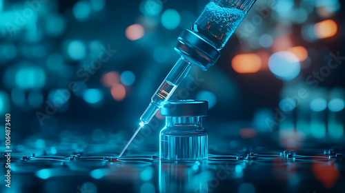 Syringe and vial with blue and red bokeh background, health and research concept.