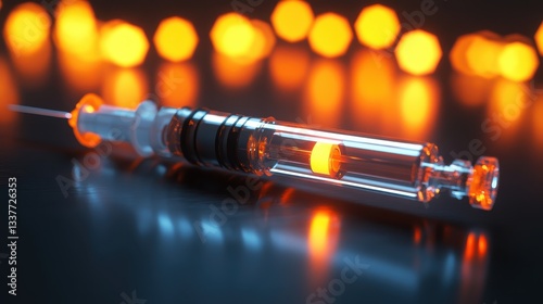 Syringe with Glowing Liquid Against a Dark Background