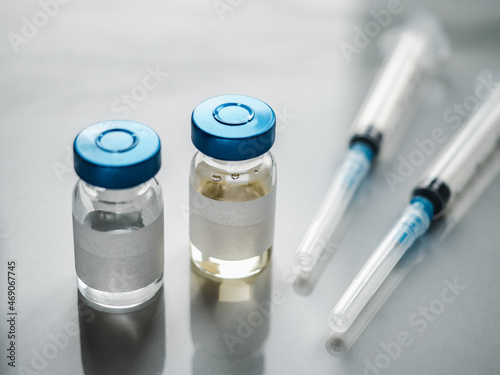 Syringes, injection bottles and tablets lying on the table. Close-up, indoors, view from above. Day light, studio photo. Healthcare concept