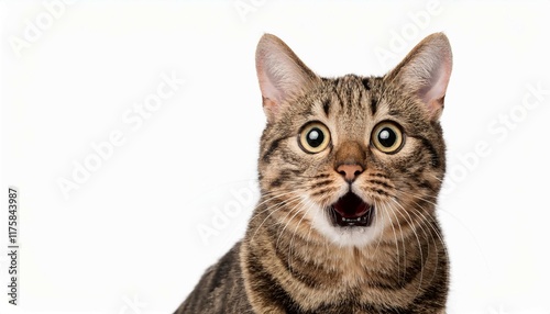 tabby cat is looking surprised with wide eyes and mouth open isolated on white background