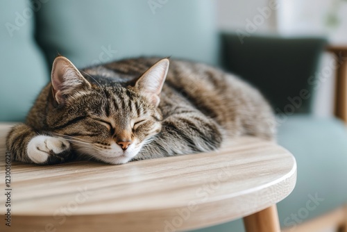 Tabby cat sleeping peacefully on a wooden table in a cozy living room