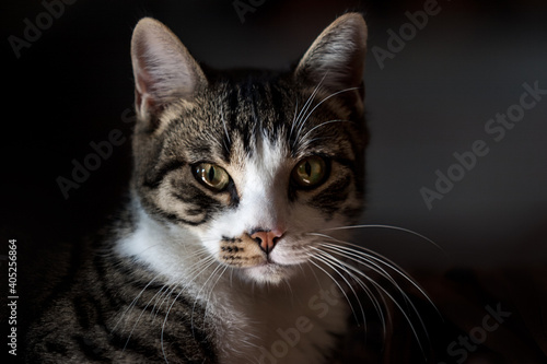 Tabby cat with long whiskers staring at the camera
