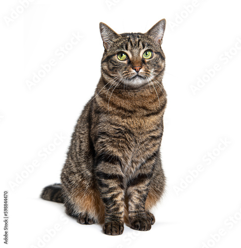 Tabby crossbreed cat looking up, exressive, isolated on white