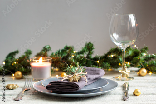 table setting for Christmas dinner with decorations on grey plate on white table. Holiday view with christmas tree.