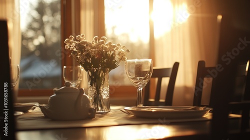 Table Setting with Flowers and a Wine Glass in the Warm Sunset Light