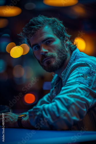 Table tennis player executing a lightning-fast smash with precision.Bearded man at table in dark room, enjoying music artist performance