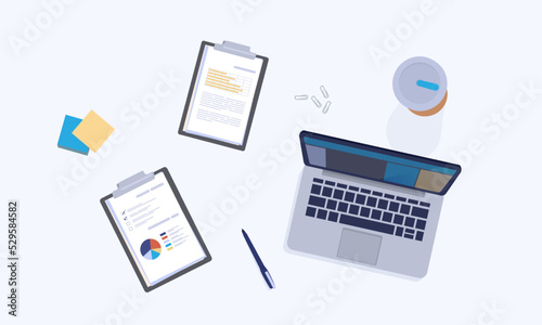 Table top view. Office workplace. Laptop on desk. Paper tablets. Electronic device. Notebook screen. Glass and stationery. Analytical report documents. Pen and note pages. Vector workspace