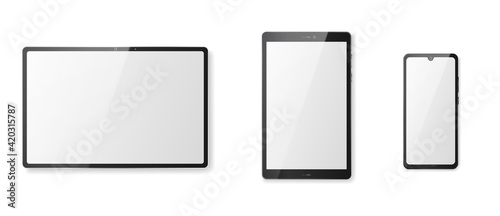 Tablet computer with white screen and black frame. Realistic mockup of modern smart gadget