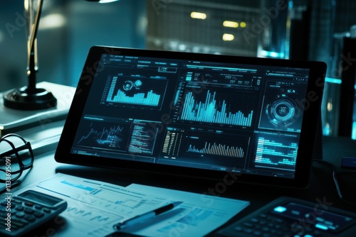 Tablet displaying financial data graphs and charts at night.