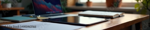 Tablet placed next to laptop on a cluttered study table , laptop, papers