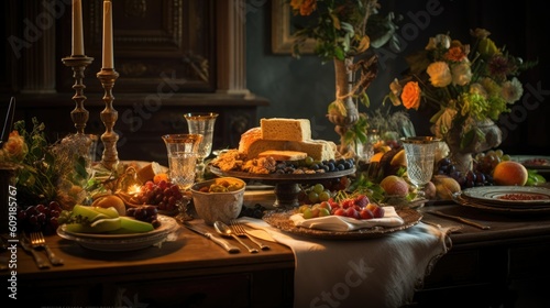 Tabletop Settings: Beautifully arranged table with carefully placed plates, cutlery, and props complementing the food, captured with a macro lens and natural light. Generative AI.