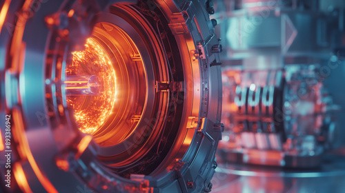 Tack-sharp shot of a fusion reactor prototype, cutting-edge energy concept, scientists at work