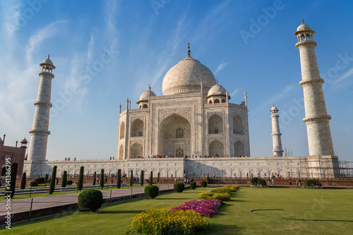 Taj Mahal - A white marble mausoleum built on the banks of the Yamuna river by Mughal king Shahjahan bears the heritage of Indian Mughal architecture.