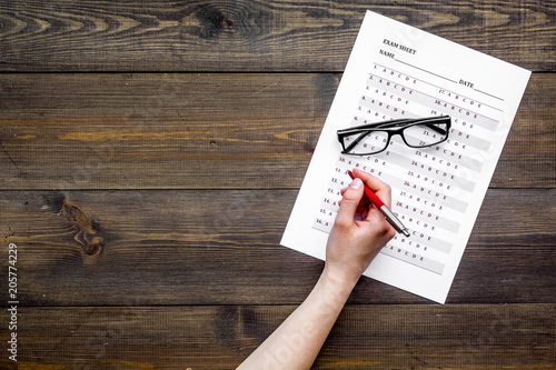 Take the exam, write the exam. Hand holding pen near exam paper on dark wooden background top view copy space