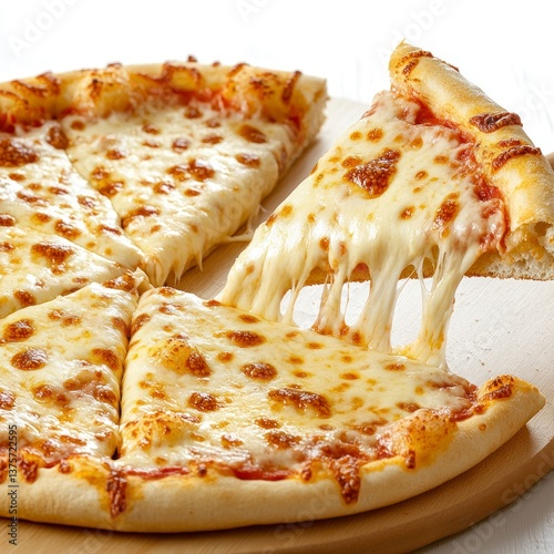 Taking Slice of Cheesy Pizza with Melted Mozzarella on Wooden Board