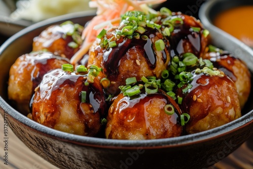Takoyaki, Ball-shaped snacks made from a batter and filled with minced or diced octopus, tempura scraps, pickled ginger, and green onions, served with takoyaki sauce and mayo.
