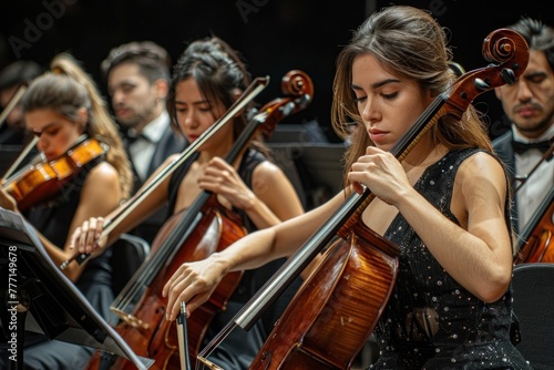Talented young cellist performing beautifully in a symphony orchestra concert