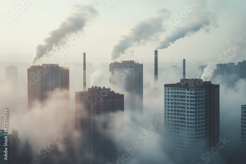 tall buildings shrouded in thick smoke and white clouds rising from the chimneys. The cityscape is visible through the misty atmosphere, environmental pollution.